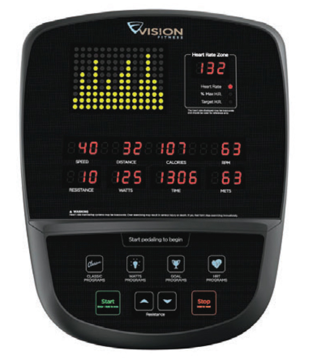 • Time, Distance, Calories, Speed, Resistance, Level, RPM, METs, Watts, Heart Rate, Target HR, % Max HR, Profile